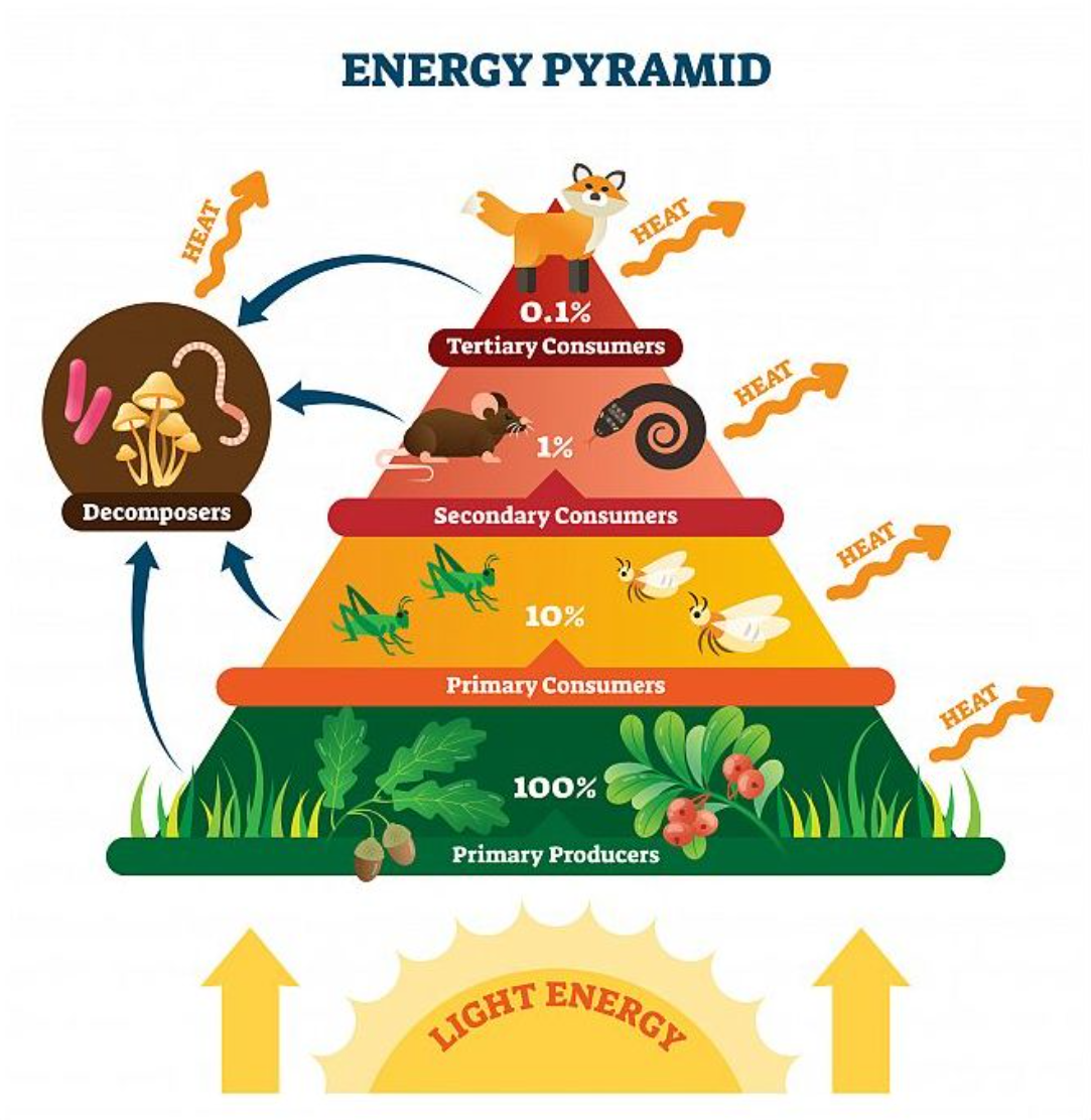 The image shows an energy pyramid for a forest ecosystem. The apex consumer level of this ecosystem contains between 500 and 1000 kilograms of biomass.