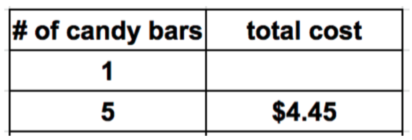The table shows the price of candy bars at a grocery store. Assume this table represents a proportional relationship.