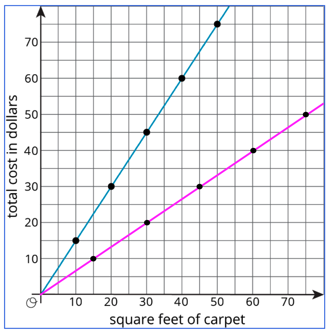 The relationships between the total cost in dollars and square feet of carpet for blue carpet and pink carpet are shown in the graph below. Which carpet gives you more square feet per dollar? 2D🌶️🌶️🌶️