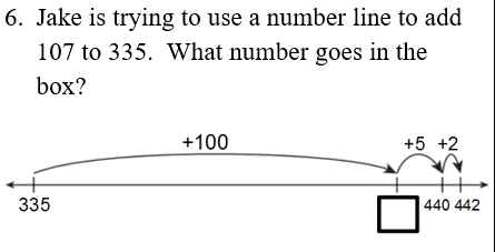 Look at the number line above. Then answer the question: Jake is trying to use a number line to add 107 to 335. What number goes in the box?