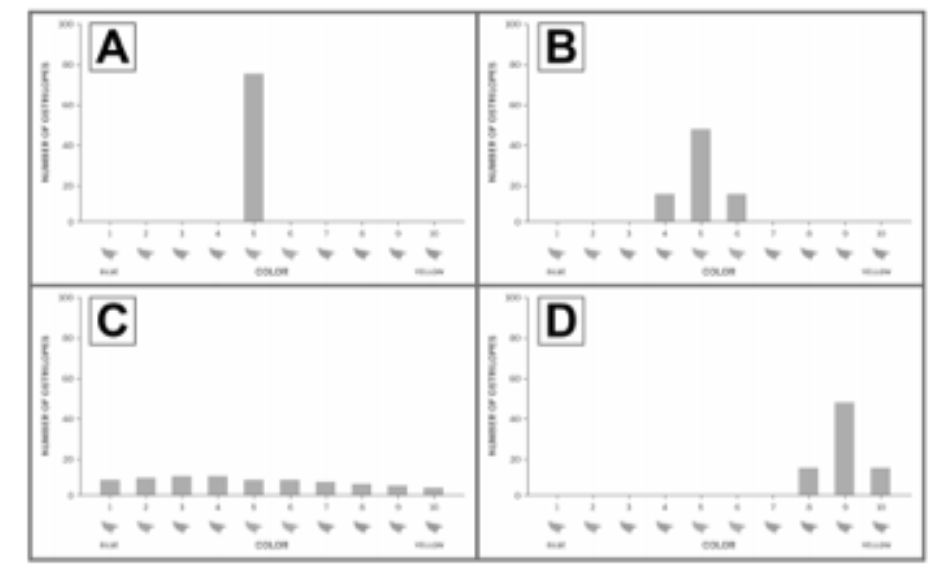Which histogram shows a population with mostly yellow ostrilopes and some variation?
