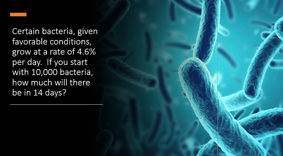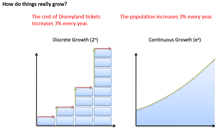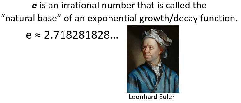 For continuous growth, instead of the base being a number it is a letter. Look at the image above and find where it says "continuous growth". What is the base of the exponent in the parentheses? Type the letter below.