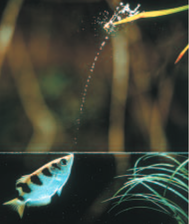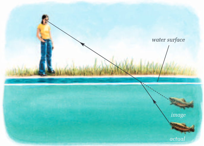 The archer fish shoots jets of water from its mouth at unsuspecting bugs perched on branches above the water. Explain, in terms of how light travels, why these fish almost always “shoot” when they are directly beneath a bug. Why don’t they aim at an angle?