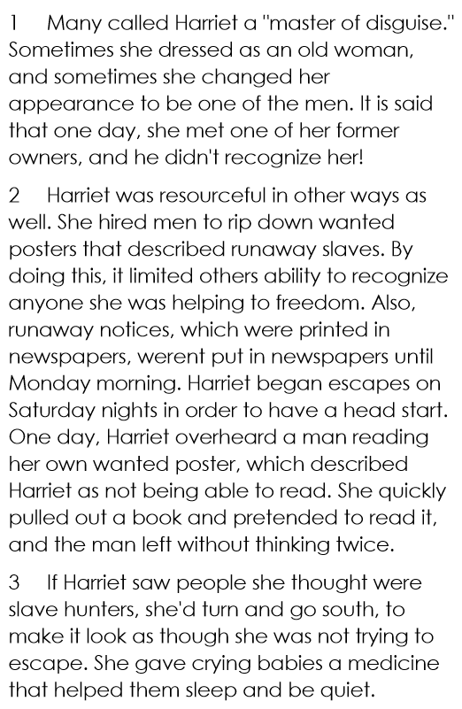 According to paragraphs 1 to 3, how did Harriet slaves escape without being noticed? Use two details to support your response.