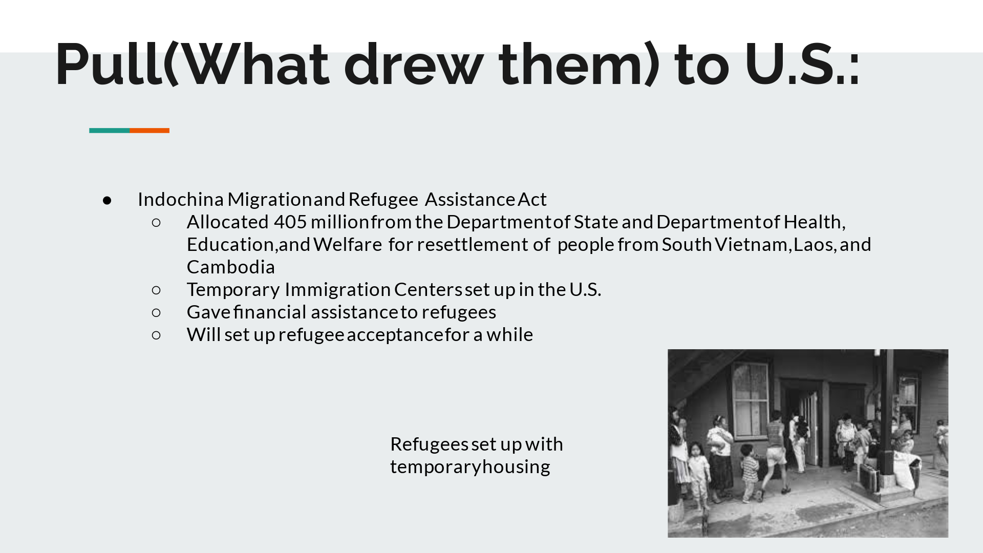 Provide a summary in 1-2 paragraphs of the S.E. Asian peoples experiences of immigration to the U.S..1. Include the push factor: Refugee crisis of the Vietnam war2. Include the Pull factor: Indochina Migration and Refugee Act 1975