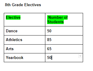 MS. Birdsong is conducting a survey of 7th graders selecting electives for next year at DVMS. The table below shows the result of the following: