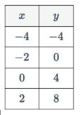 Using the following table, write an equation for the line in slope-intercept form. / Usando la siguiente tabla, escribe una ecuación para la línea en forma pendiente-intersección.
