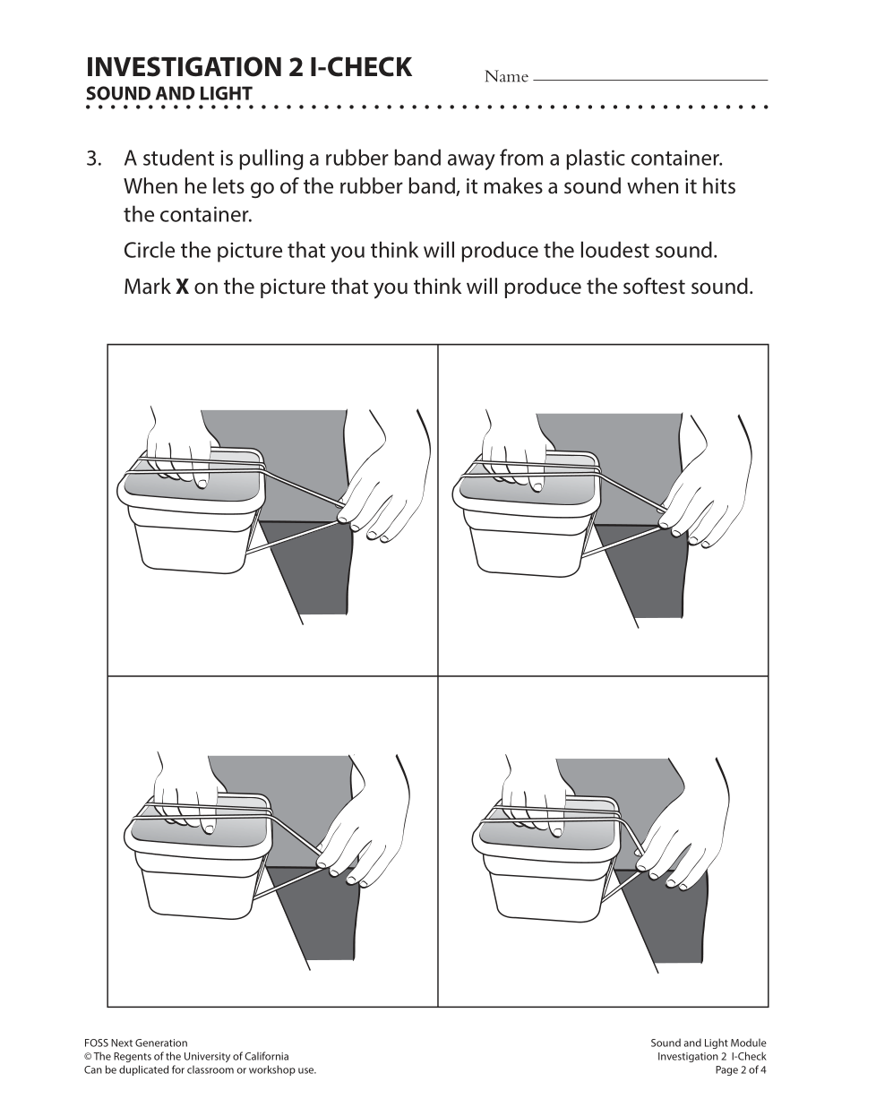 A student is pulling a rubber band away from a plastic container. When he lets go of the rubber band, it makes a sound when it hits the container.Mark X on the picture that you think will produce the softest sound.