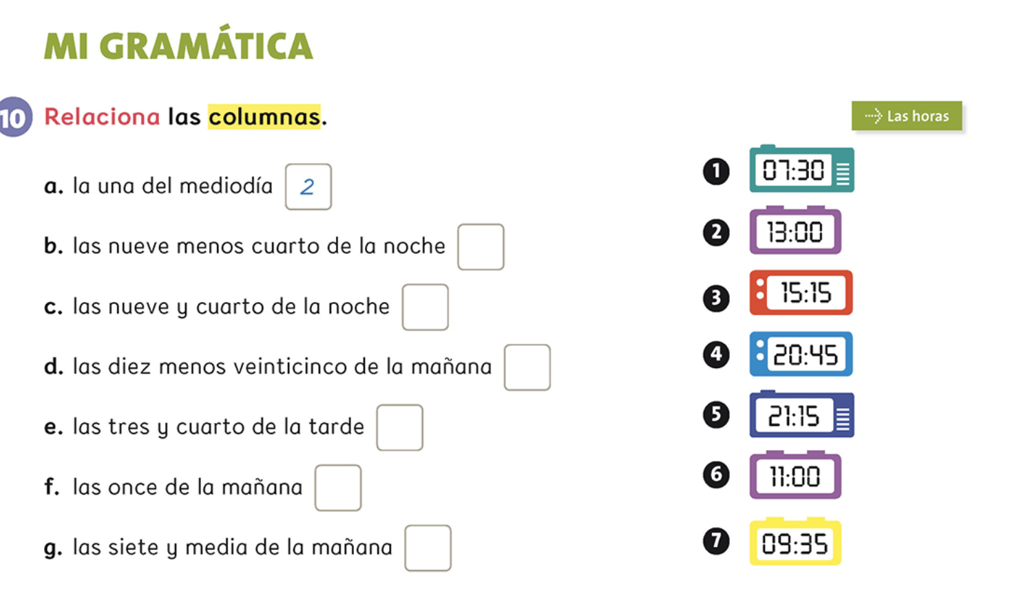 Mira el horario y relaciona las preguntas con sus respuestas. Look at the timetable again and match the questions with answers.