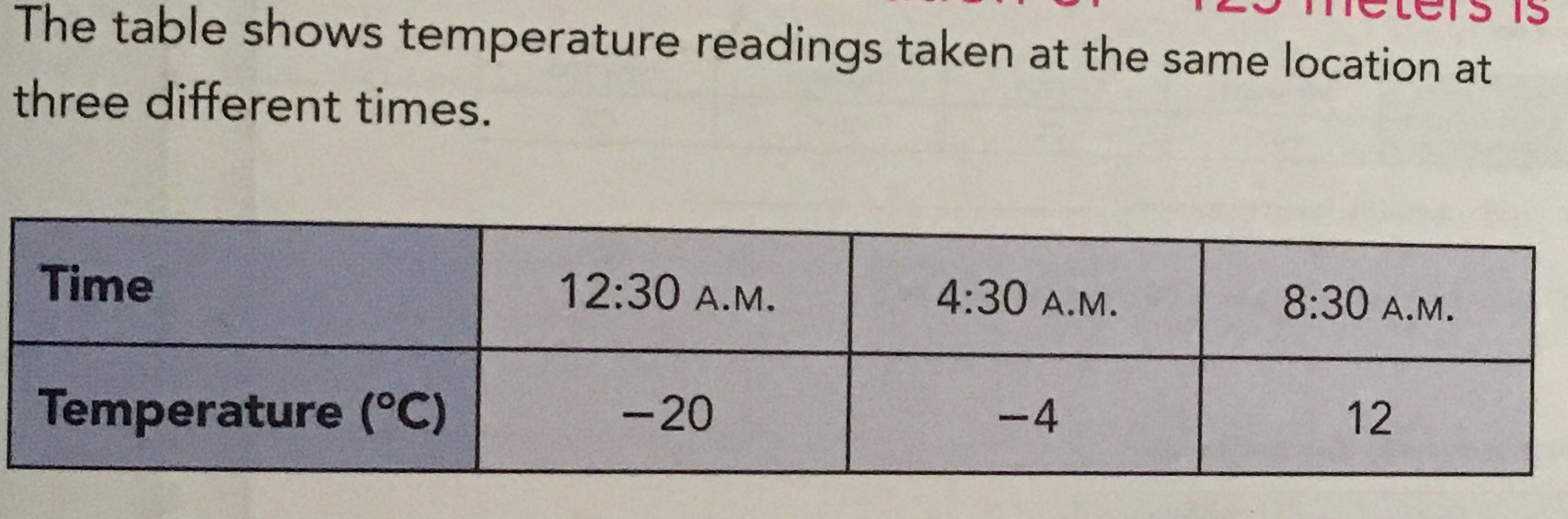 Between 12:30 and 8:30 a.m. the temperature was always rising. Between what two times in the table did the temperature reach 0 degrees?