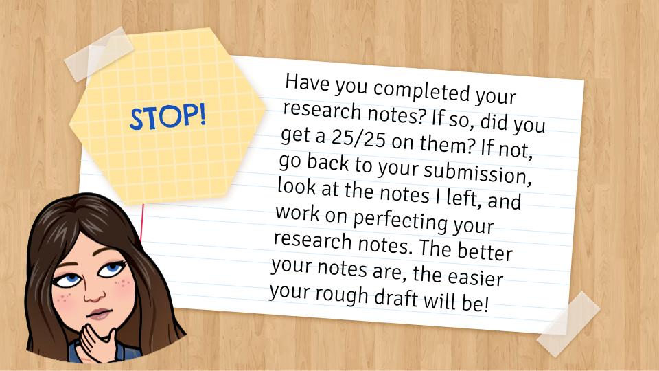 If you have not yet turned in your research notes or did not receive full credit on your research notes, watch the short video on the next slide (hint: you might have seen this before on Moodle!). There are some tips on conducting research for your approved topic and writing your research notes for your submission!