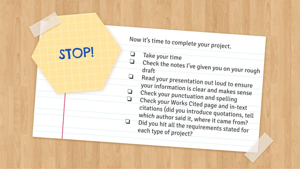 If you are ready, submit that presentation and be proud of your work! Remember, we are a school of mastery, so you are able to make corrections and resubmit any portion of your project until it's perfect!