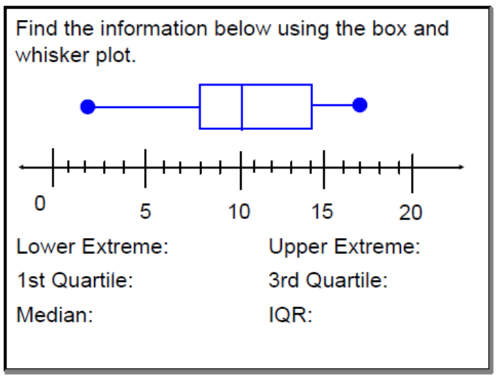 Use the data set given to fill in the five-number summary and IQR, then draw the box and whisker plot.