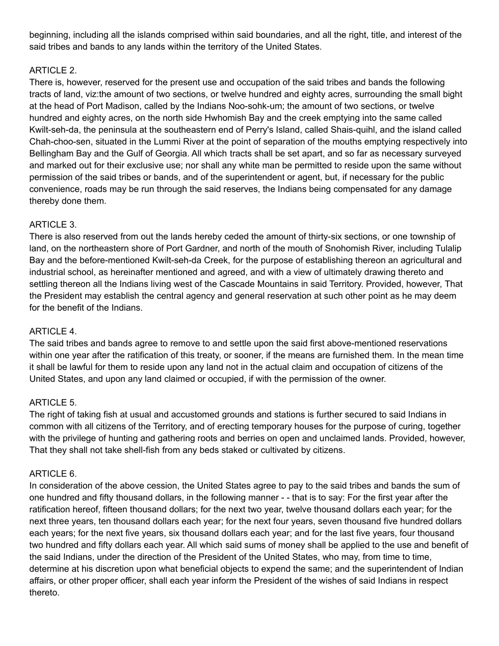 In this excerpt from the "Point Elliott Treaty", what is the purpose of Article 3? How does this article highlight some of the cultural differences in values between tribes and white populations?