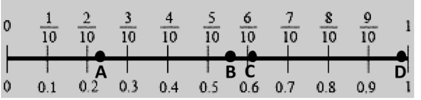 ¿Qué letra representaría 0.22 en esta recta numérica?