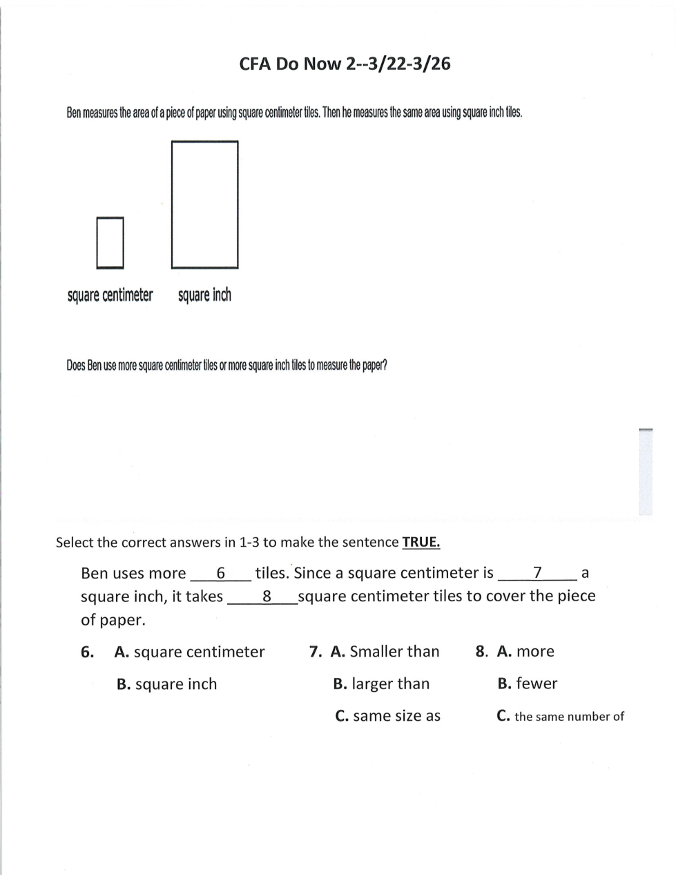 Ben uses more ____tiles. Since a square centimeter is _____ a square inch, it takes _____square centimeter tiles to cover the piece of paper.