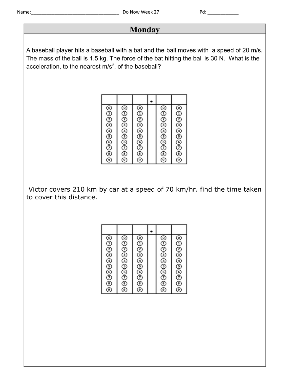 A baseball player hits a baseball with a bat and the ball moves with a speed of 20 m/s. The mass of the ball is 1.5 kg. The force of the bat hitting the ball is 30 N. What is the acceleration, to the nearest m/s2, of the baseball?