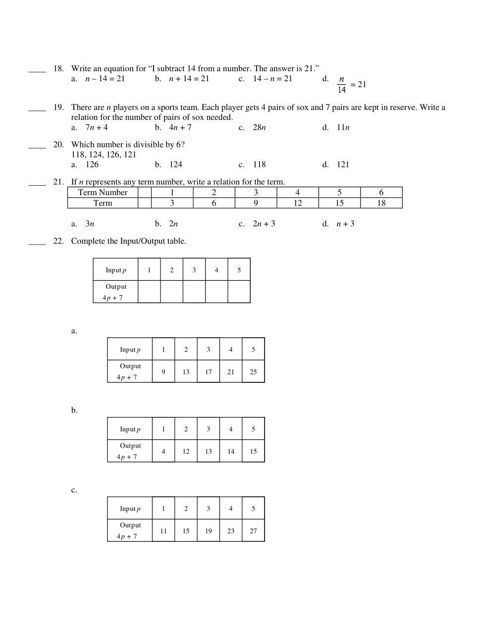 There are n players on a sports team. Each player gets 4 pairs of sox and 7 pairs are kept in reserve. Write arelation for the number of pairs of sox needed.