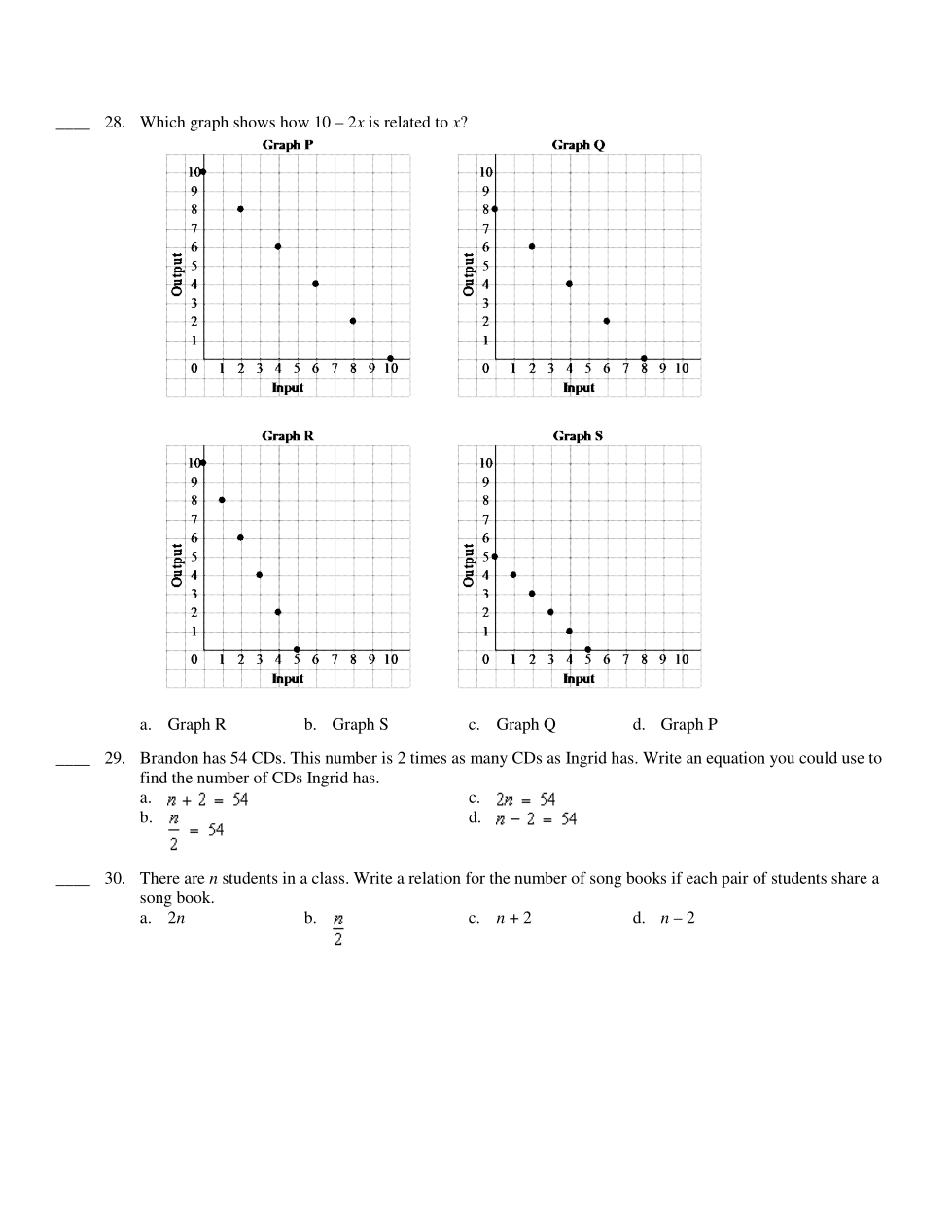 Which graph shows how 10 – 2x is related to x?