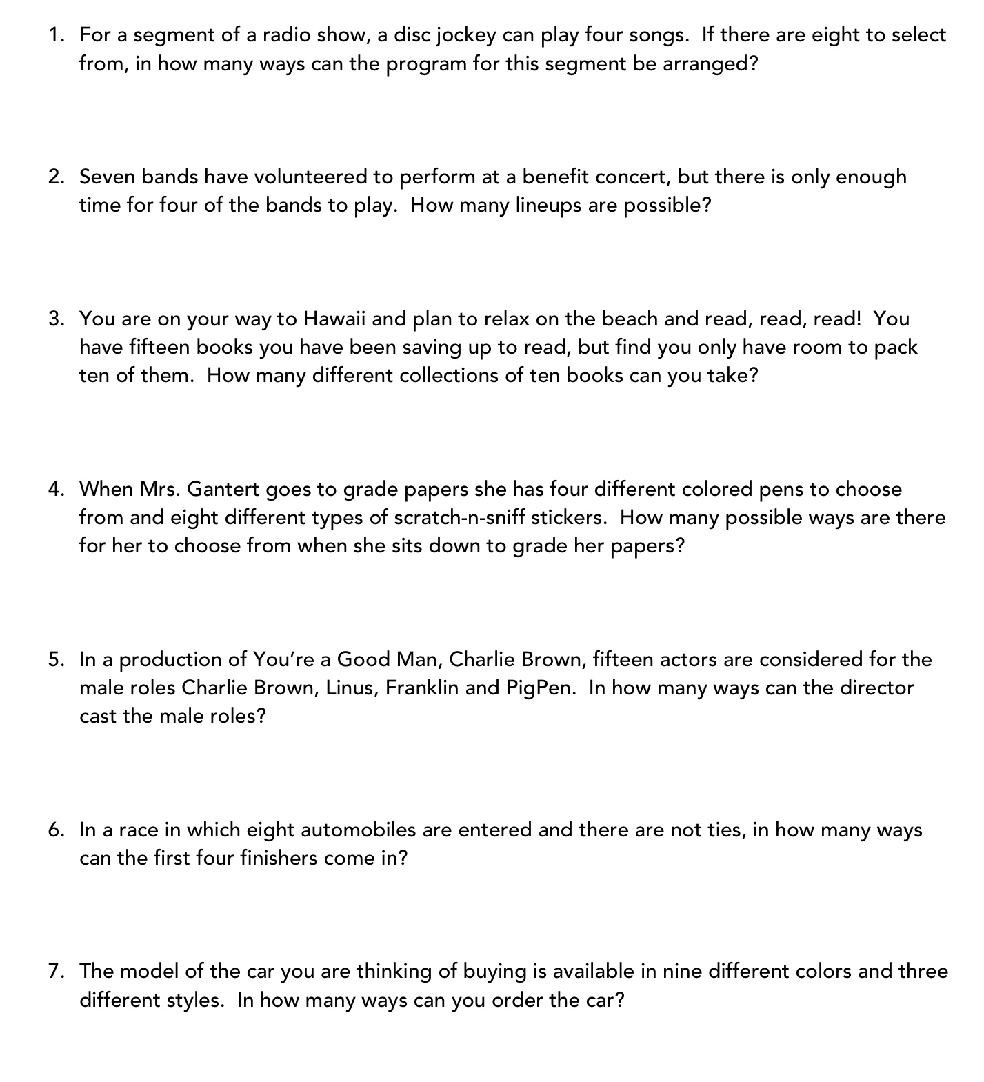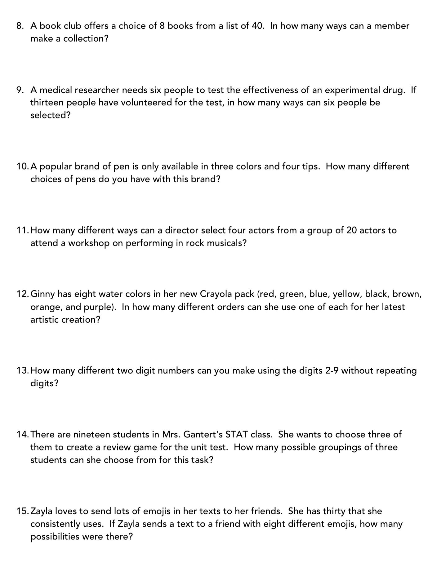 Determine if the scenario involves a permutation, a combination, or the multiplication principle of counting. Then set up and solve using the correct notation and calculations to find the number of possibilities.