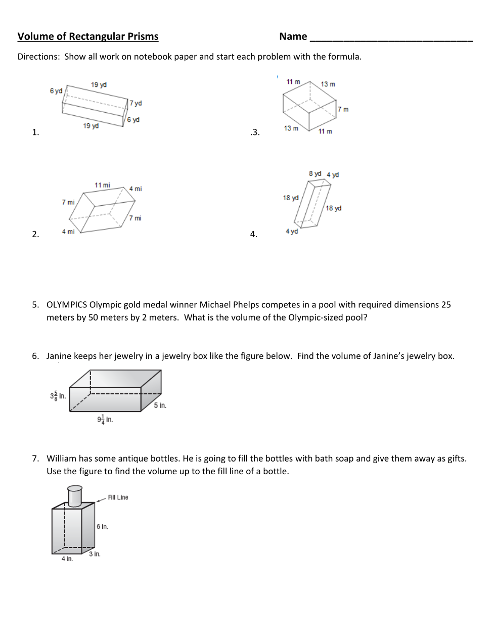 Find the volume. Your work must include the formula, substitute the values and label your answer. This is required for all 10 problems.