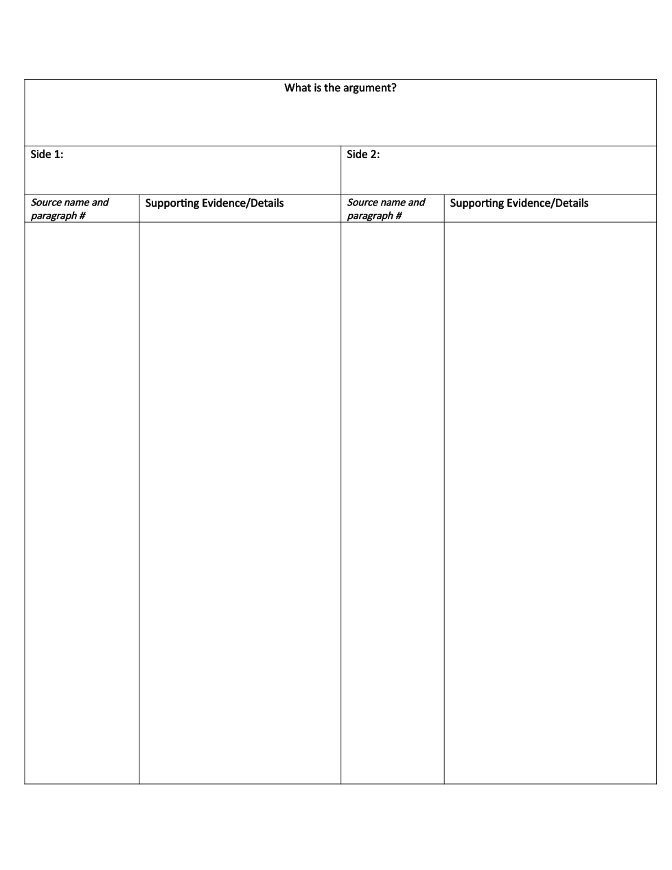 Now, you will organize your evidence. For side one, list the source name, location, and the detail. Then, for side two, repeat the same steps.