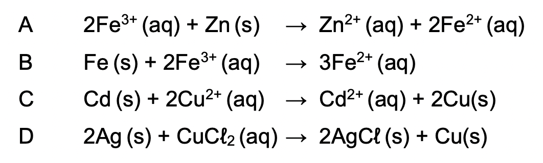 Identify ONE substance being oxidised, ONE being reduced, ONE spectator ion, ONE oxidising agent and ONE reducing agent from the list of possible answers.