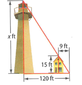A 15 foot tall house stands 9 feet from its property marker. A nearby lighthouse stands 120 feet from the same property marker. Find the height of the lighthouse.