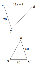 The two triangles below are similar. Use the similarity statement; SRT ~ BCD to write a proportion and solve for the missing length.