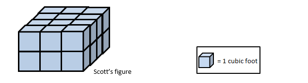 Scott made the figure below. Eliza made a similar figure. However, she used 4 times as many cubes. What is the volume of Scott’s and Eliza’s figures together? Show your thinking.
