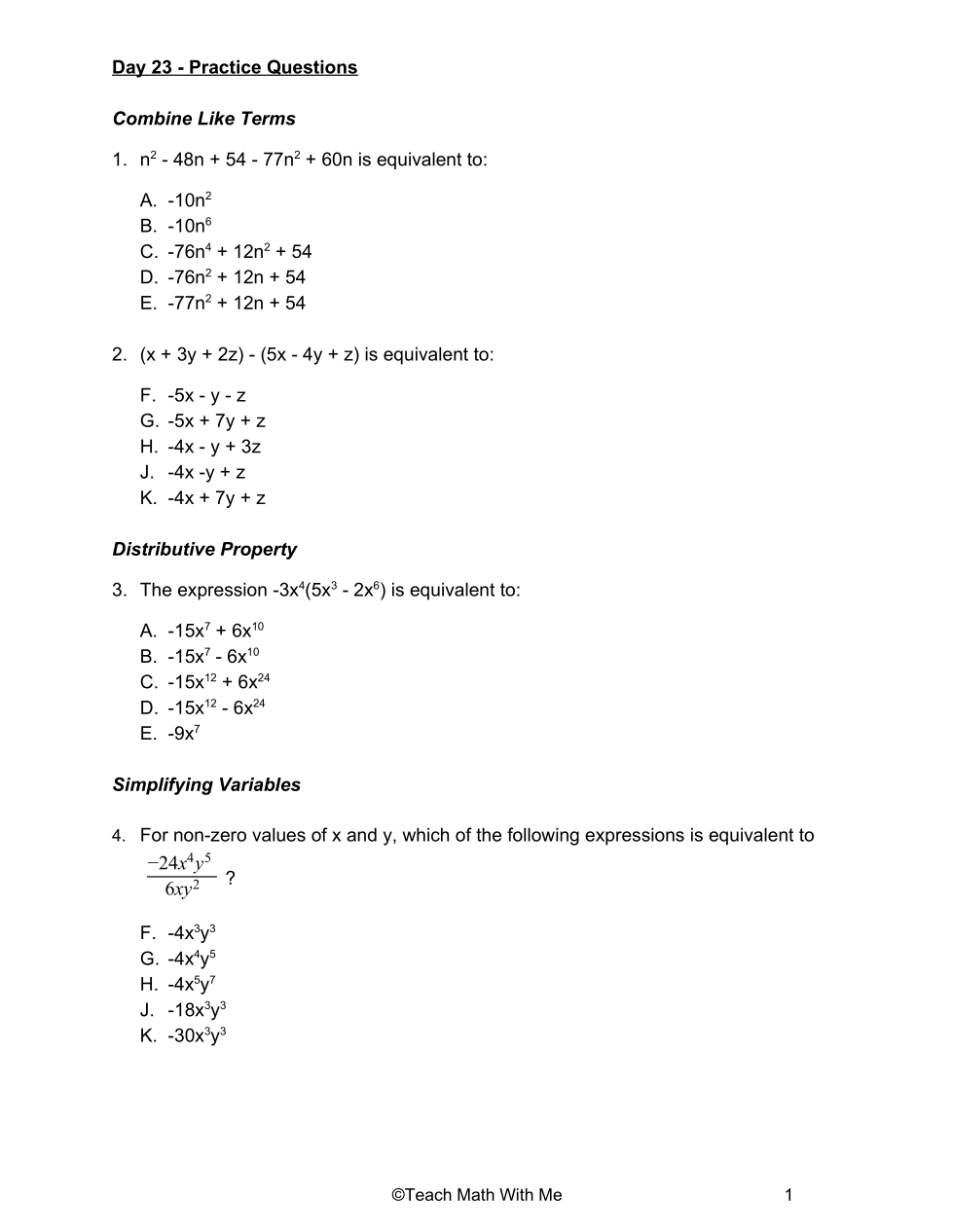 Comb Like Terms/Dist Proprty/Simp Var HW