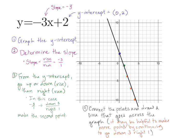 If you are having trouble remembering how to graph a line, you can find the full step-by-step notes in your algebra folder on drive (the notes in the example folder is are here: https://drive.google.com/file/d/14NkTh8aNk4_Y2T-RrDPQAryb-CNYMZFb/view?usp=sharing)
