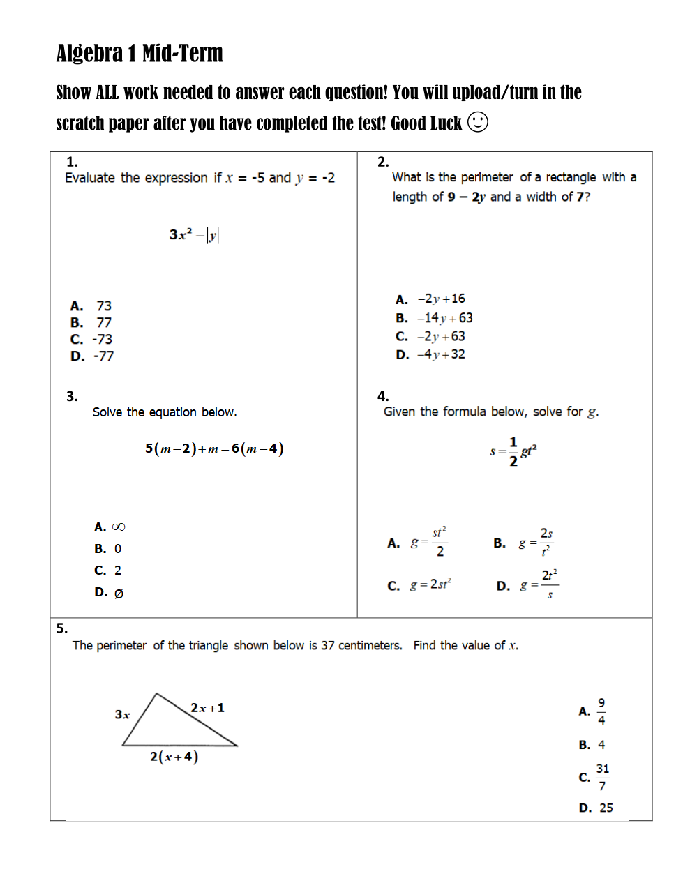 Algebra 1 Mid-Term S2