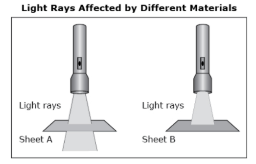 Part A: Based on the ways light rays travel when aimed at Sheet A and Sheet B, identify the type of material of each sheet using the terms opaque, transparent, or translucent and explain how you know. (4 points)