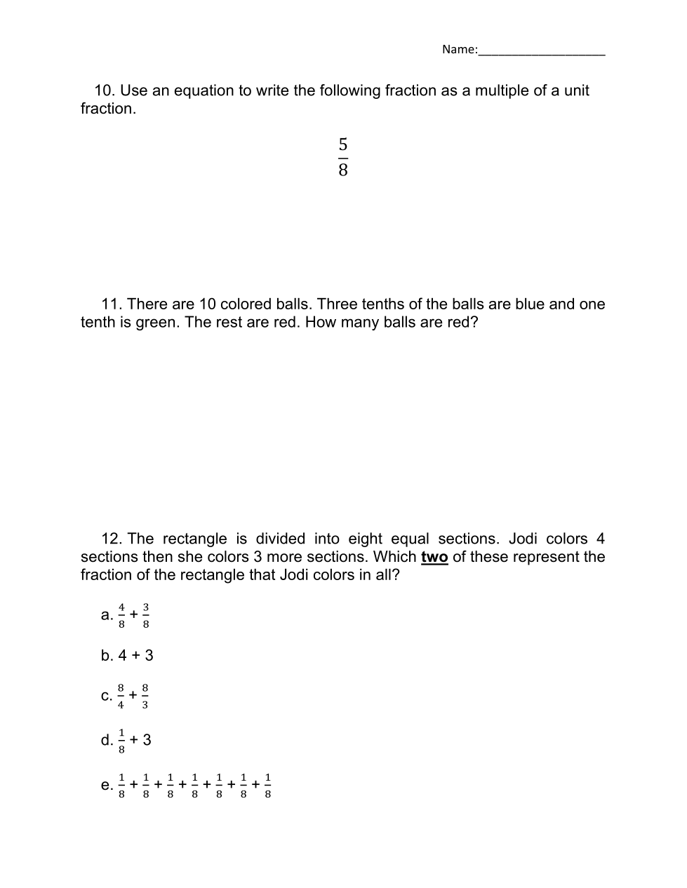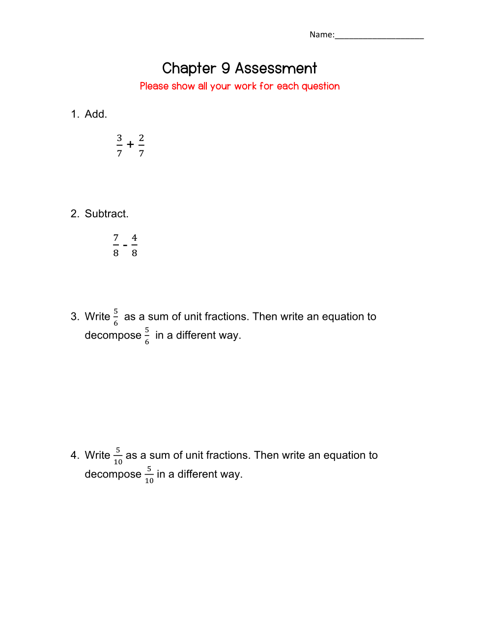 Write 5/10 as a sum of unit fractions. Then write an equation to decompose 5/10 in a different way.