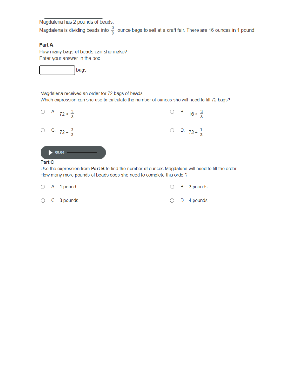 How many bags of beads can she make? Notice the difference in units, 2 pounds of beads and 2/3 oz bags. The conversion rate is 16 oz=1 pound.