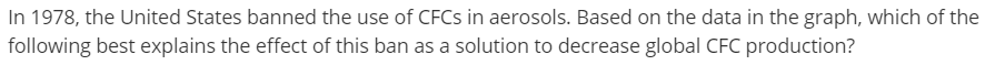 The Montreal Protocol led to a dramatic reduction in CFC production globally after 1987, which greatly reduced the concentration of chlorinated hydrocarbons present in the stratosphere and decreased the breakdown of stratospheric ozone. Based on the graph, the annual production of CFCs decreased significantly in the late 1980s to almost 0 tons by 2000