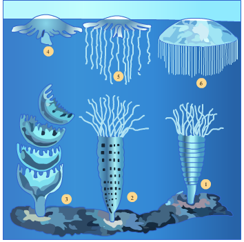1: Een kwal in het poliepstadium besluit zich voort te planten.