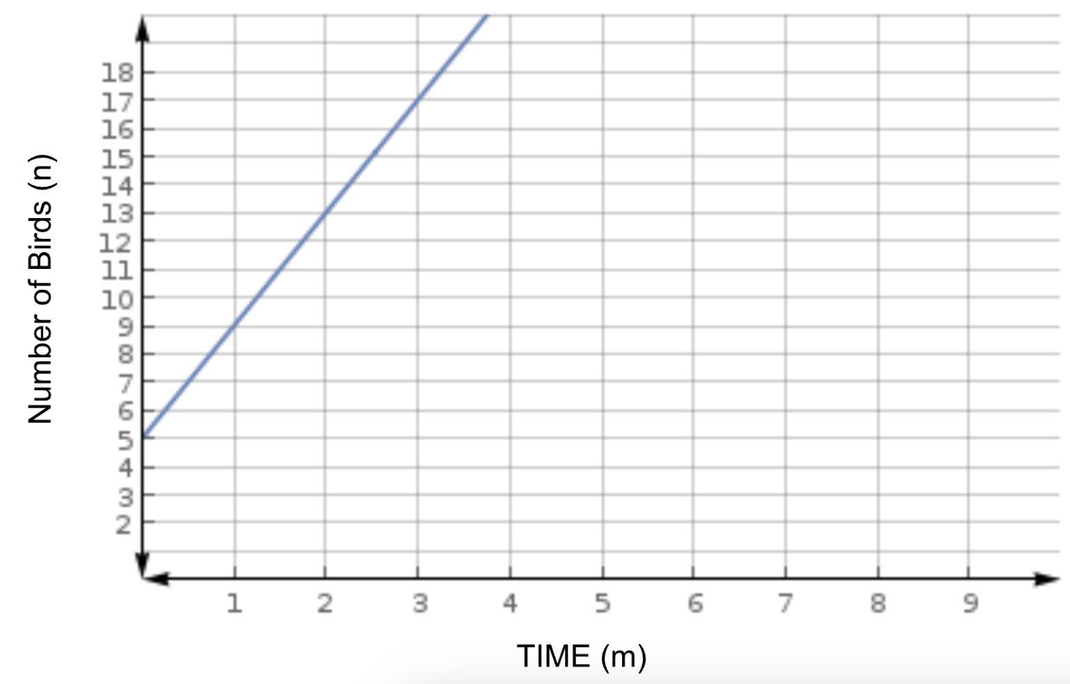 Kazeem takes up bird watching. He has already identified 5 different types of birds when he sets a goal to increase the number of birds he has identified. Below is a graph that represents the number of birds he identifies after he sets his goal.