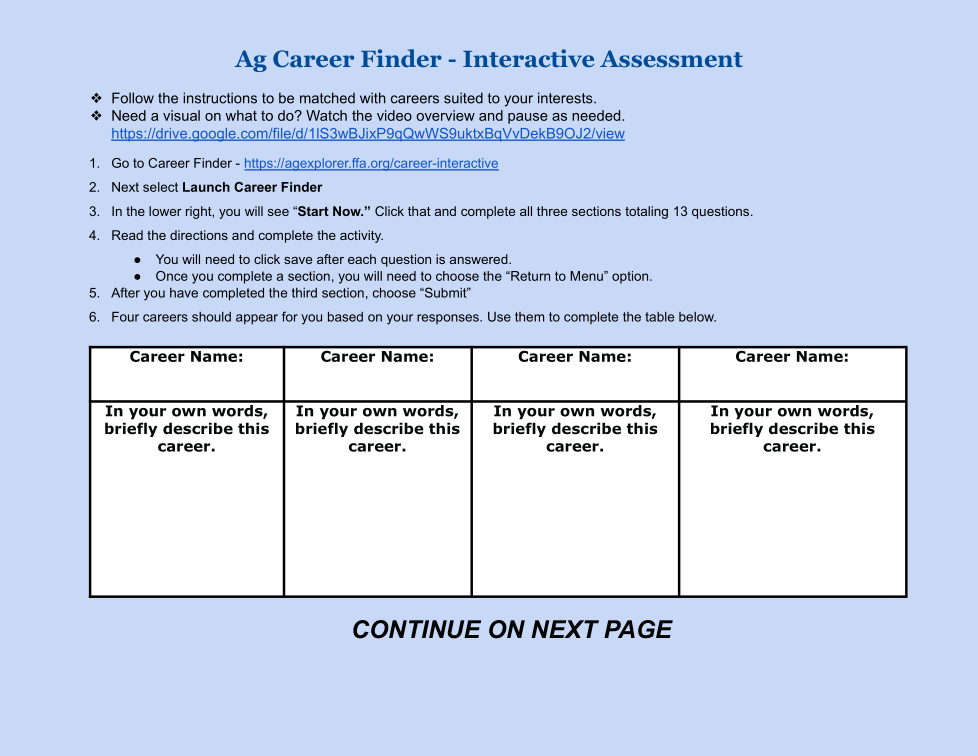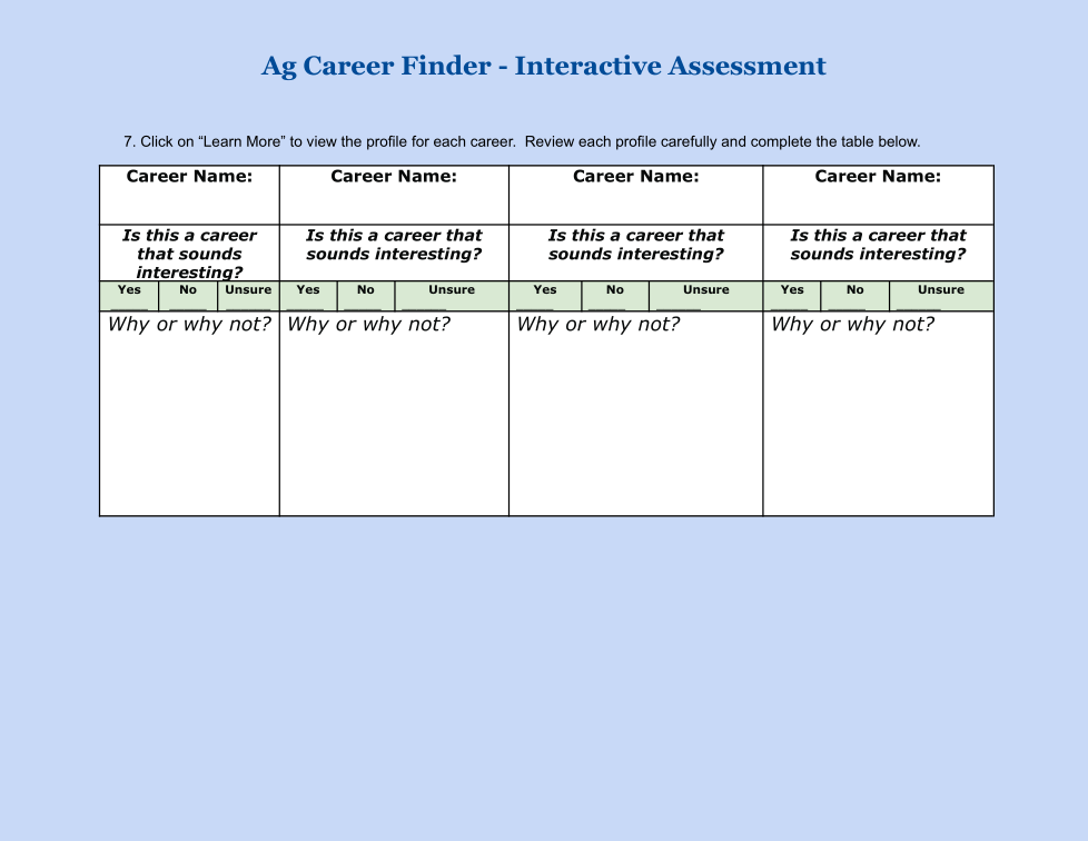 This is a guided activity for students to use when exploring the National FFA Ag Explorer Career Finder. Top job results and whether or not they might want that career and considered.