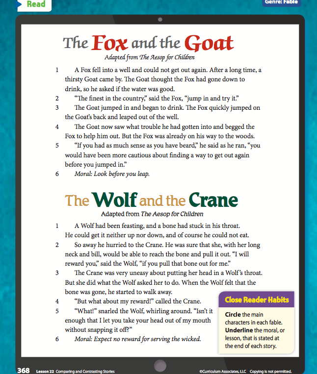 Close Reader HabitsCircle the main characters in each fable. Underline the moral, or lesson, that is stated at the end of each story.