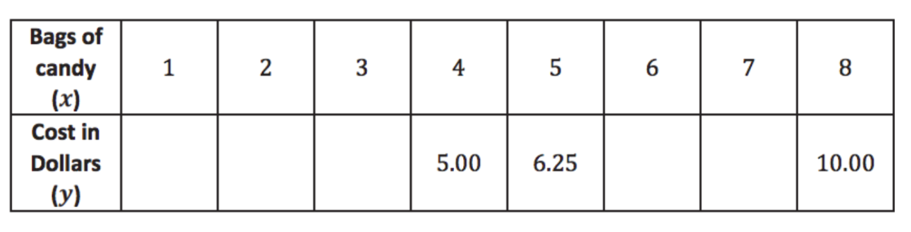 Determine the cost of one bag of candy, assuming the price per bag is the same no matter how much candy is purchased. Then, complete the table.