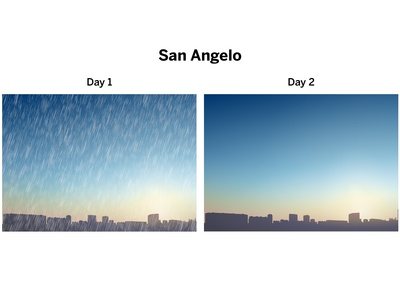 Day 1 and Day 2 in San Angelo started with the same amount of water vapor in the air parcels in the area. It rained at the end of Day 1 but it did not rain at the end of Day 2.
