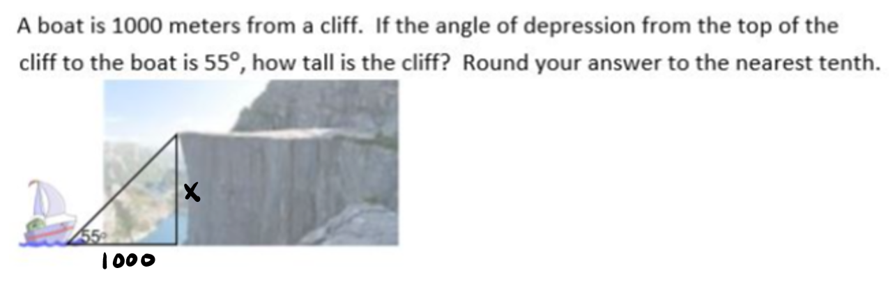 A boat is 1000 meters off a cliff. Of the angle of depression from the top of the cliff to the boat is 55 degrees, how tall is the cliff? Round to the nearest tenth.