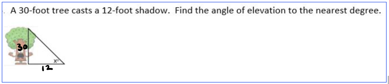 A 30 ft tree casts a 12 foot shadow. Find the angle from the base of the shadow to the top of the tree. Round to the nearest tenth.
