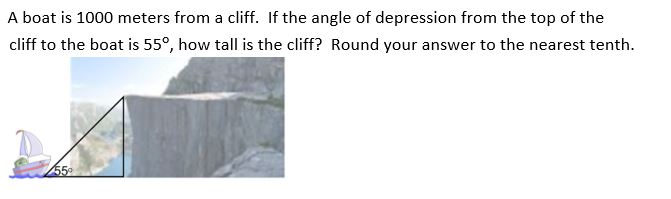 A boat is 1000 meters off a cliff. Of the angle of depression from the top of the cliff to the boat is 55 degrees, how tall is the cliff? Round to the nearest tenth.