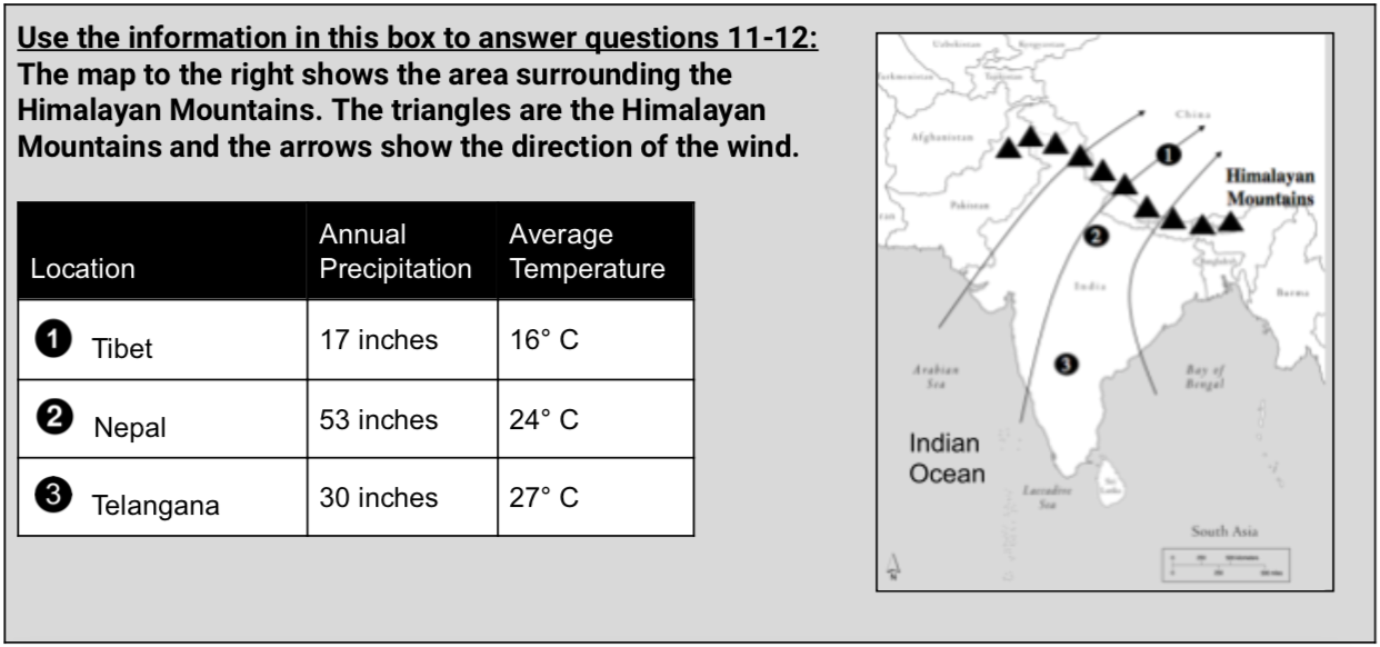 Why does Tibet receive less rainfall than Nepal? Include evidence from the map or the table to support your answer. (5 pts)