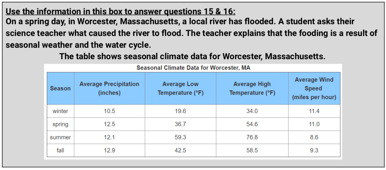 Identify the season when the greatest amount of water moves from Earth’s surface into the atmosphere in Worcester. Explain why this season has the greatest amount of water moving into the atmosphere. Include data from the seasonal climate table and describe the role of energy to support your answer. (7 pts)