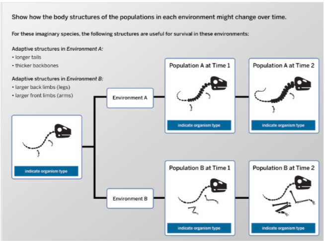 Move organisms from the toolbar to the open locations in both branches of the tree.