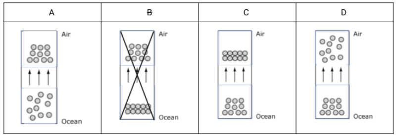 On a summer day, water particles from the ocean change phase as they move into the air. Which model best shows this change? Use the models above. (2 pts)